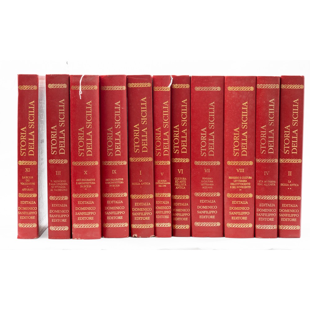 UNDICI VOLUMI: AA. VV. STORIA DELLA SICILIA ed. Editalia / Domenico Sanfilippo, Roma 1997. Opera in 11 volumi. cm 22,5 x 31. Legatura in pelle con titoli e impressioni in oro al piatto e al dorso. Piano dell’opera: vol I° La Sicilia Antica 1; vol II° La Sicilia antica 2; vol III° Il Medioevo dalla conquista musulmana al viceregno; vol IV° L Età moderna fino all Unità; vol V° La Sicilia contemporanea 1861-1996; vol VI° Cultura e arte nell età antica; vol VII° Pensiero e cultura letteraria siciliana 1; vol VIII° Pensiero e cultura letteraria siciliana 2; vol IX° Arti figurative e architettura in Sicilia 1; vol X° Arti figurative e architettura in Sicilia 2: vol XI° La Sicilia dei viaggiatori. Legatura in mezza pelle con impressioni in oro sul dorso e scritte sul piatto. Oltre 5000 pagine e più di mille illustrazioni. Volumi in più che discrete condizioni.