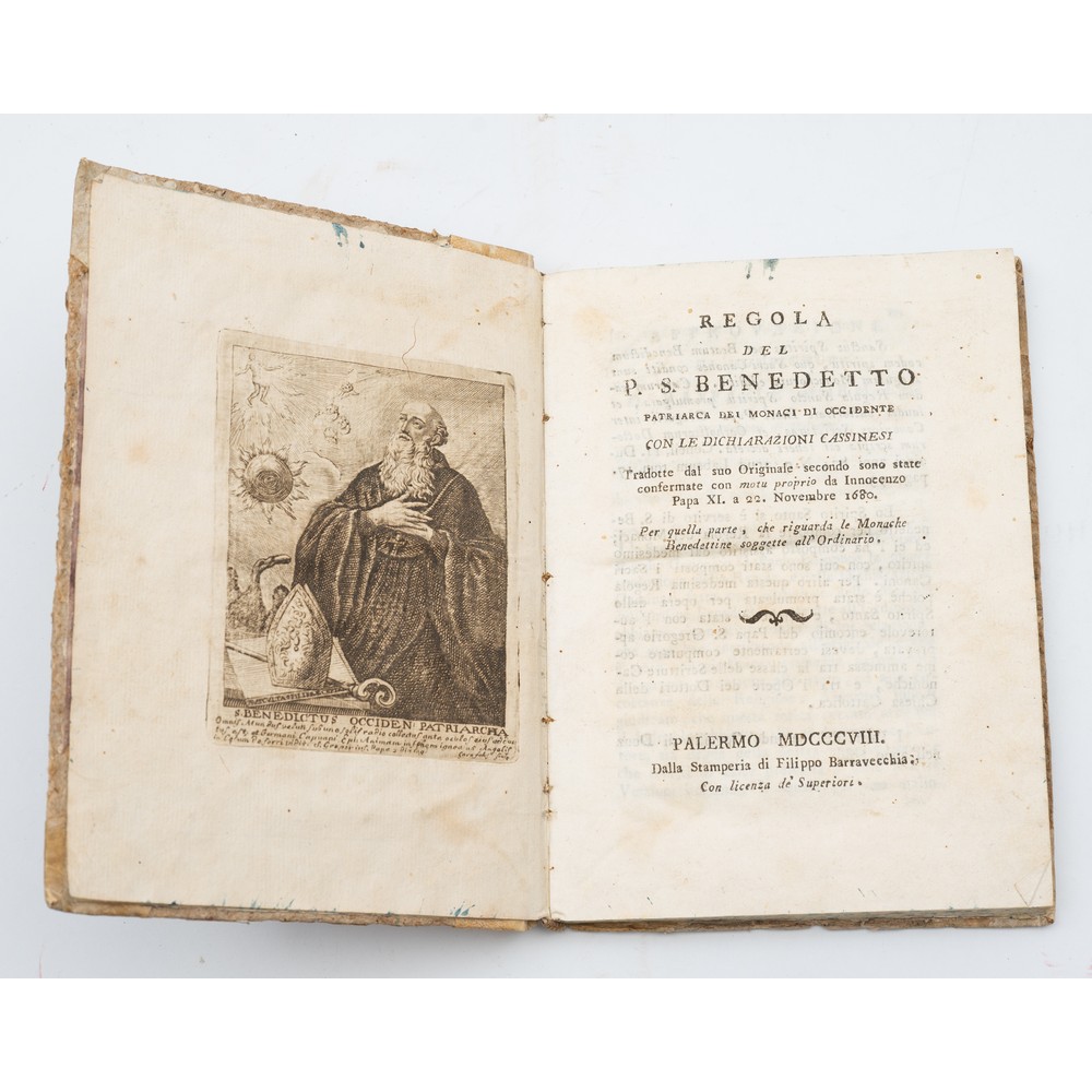RARISSIMO VOLUME EDITO A PALERMO: REGOLA DEL P. S. BENEDETTO PATRIARCA DEI MONACI DI OCCIDENTE CON LE DICHIARAZIONI CASSINESI, ed. Palermo Dalla Stamperia di Filippo Barravecchia 1808. In 16° grande. Bella incisione xilografica in antiporta raffigurante S. Benedetto da una incisione del Palermitano Giuseppe Garofalo. Legatura in mezza pergamena con piatti cartonati. In ottime condizioni con pagine pulite, ben tenute e ancora fruscianti. Tagli spruzzati. Pp. XVI, 139.