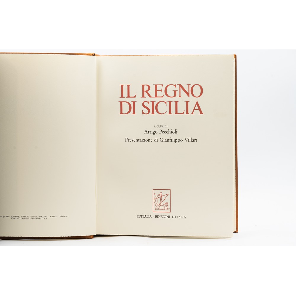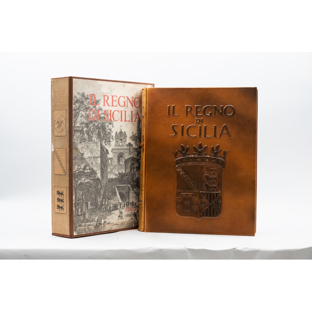 Arrigo Pecchioli – a cura di - IL REGNO DI SICILIA, Editalia - Edizioni d’Italia - MCMXCIV. Presentazione di Gianfilippo Villari. In folio. Volume in custodia editoriale in legno rivestito in pelle e con illustrazioni applicate a specchio. Stampata su carta speciale delle Cartiere Miliani Fabriano. Legatura in pelle di vitello, con concia vegetale al sego, tamponata a mano all'anilina e impressioni in oro zecchino della ditta Antinori di Roma. lo sbalzo della copertina in pelle primo fiore è dello scultore Mario Picchi così come gli stemmi che ornano i capilettera. Con illustrazioni e tavole f. t. Esemplare n. 1372/ 2499. Piedini in bronzo al piatto posteriore e segnalibro editoriale in pelle di vitello con filetti in oro. con placca in rame col nome del proprietario ancora da incidere e certificato e dell’Archivio Caputo sulla “Collezione di Federico II”. Usure d’uso e da esposizione al cofanetto e al dorso. volume interno in perfette condizioni. Pp. 278.