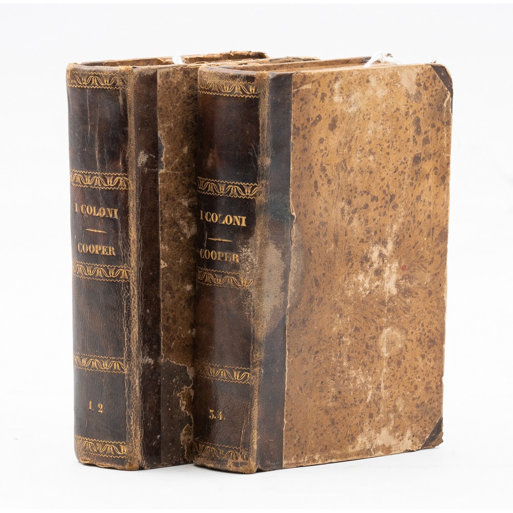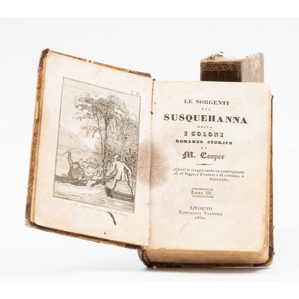 DUE OTTOCENTINE IN 16° di James Fenimore Cooper LE SORGENTI DEL SUSQUEHANNA OSSIA I COLONI, ed. Livorno Vignozzi 1830 - 1831. 2 tomi che contengono quattro libri. Legature coeve in mezza pelle con piatti cartonati. Titoli e fregi impressi in oro ai dorsi. Pp. 898 continuative. Incisioni xilografiche alle antiporte. Molto raro.