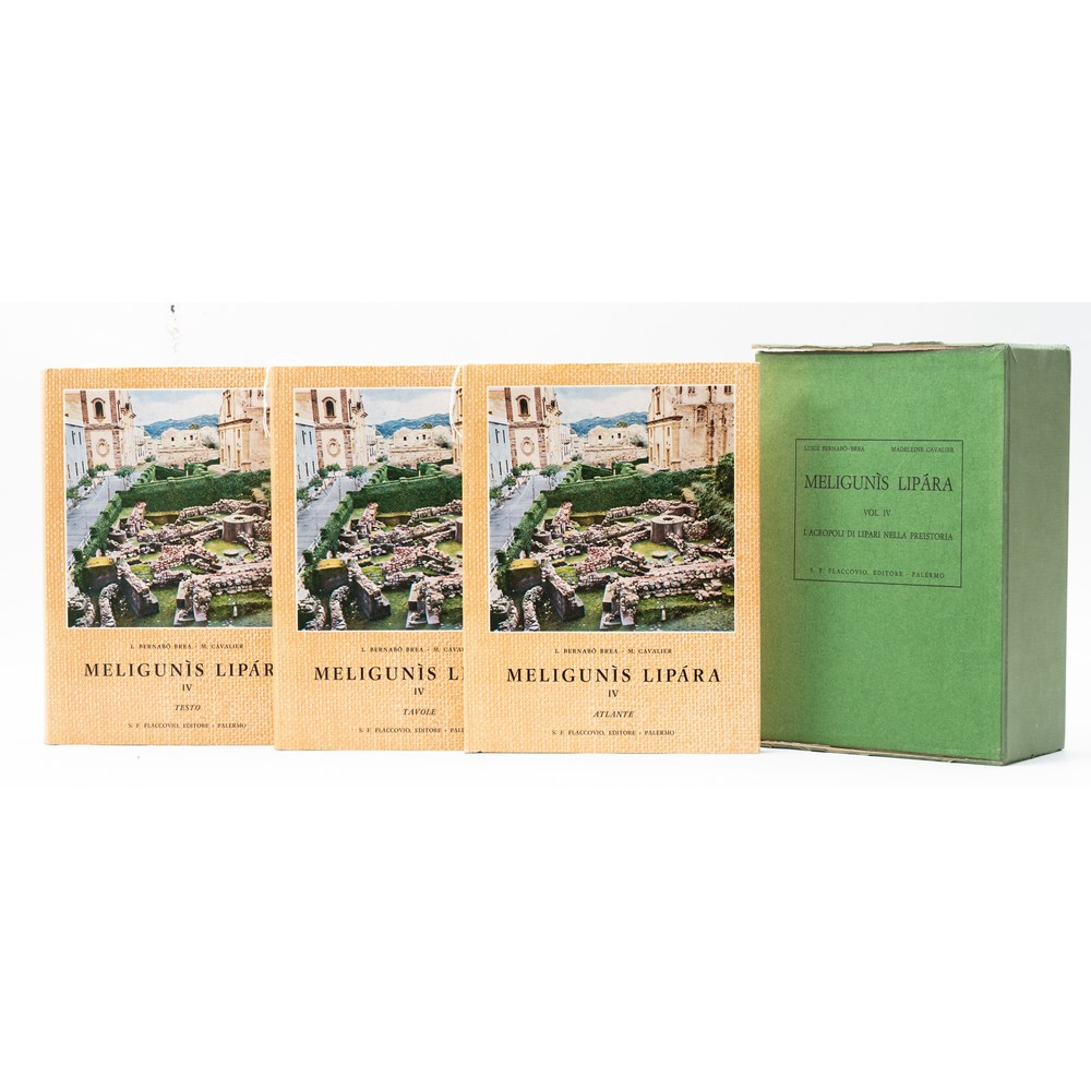 TRE VOLUMI IN COFANETTO. Luigi Bernabò Crea / Madeleine Cavalier MELIGUNIS LIPARA VOL IV L'ACROPOLI DI LIPARI NELLA PREISTORIA, ed. Palermo, Flaccovio 1980. 3 volumi in cofanetto in 4°. Legature editoriali con sopracoperte editoriali illustrate. Cofanetto editoriale in cartonato rigido. Volumi in perfette condizioni. Pp. 875; CCCXXII di tavole e volume di tavole più volte ripiegate dei siti archeologici.