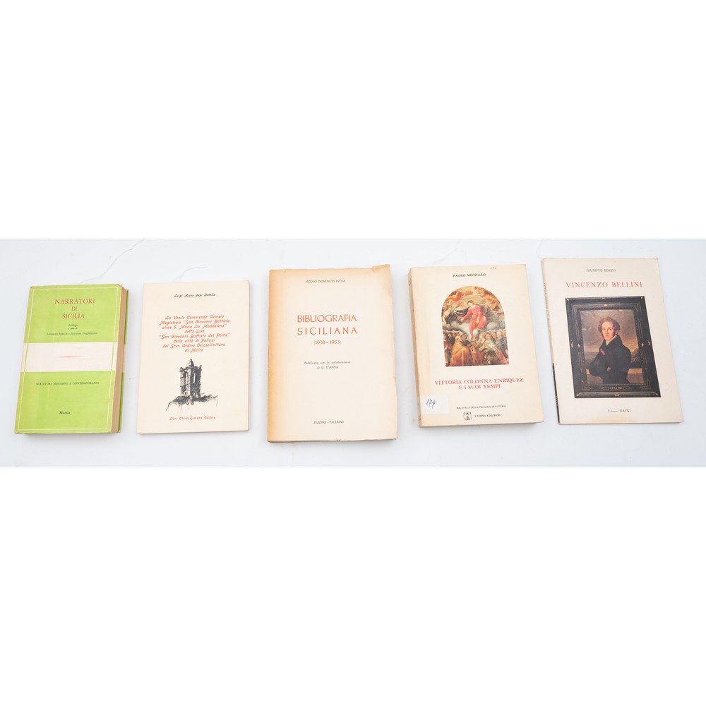 CINQUE VOLUMI DI VARIA SULLA SICILIA: 1) Luigi Ajosa Pepi Statella LA VENERABILE COMMENDA CAMERA MAGISTRALE “SAN GIOVANNI BATTISTA ALIAS S. MARIA MADDALENA” DETTA PURE “ SAN GIIVANNI BATTISTA DEL PONTE” DELLA CITTA’ DI POLIZZI DEL SOVR. ORDINE GEROSOLIMITANO DI MALTA, ed. Palermo, Thule 1985. In 8°. Brossura editoriale figurata. Volume in perfette condizioni. Pp. 111.2) Giuseppe Bozzo VINCENZO BELLINI, ed. Dafni, Catania 1980. In 8°. Brossura editoriale illustrata. Volume in ottime condizioni. Pp. 52, (1).3) Paolo Monello VITTORIA COLONNA ENRIQUEZ E I SUOI TEMPI, ed. Chiaramonte Gulfi, Utopia Edizioni 1991. Brossura editoriale illustrata con ali. Volume in ottime condizioni. Pp. 366. 4) Leonardo Sciascia / Salvatore Guglielmino - a cura di - NARRATORI DI SICILIA, ed. Mursia, Milano 1967. 1^ edizione. In 8°. Introduzione, scelta e commento a cura di Leonardo Sciascia e Salvatore Guglielmino, Collana: Scrittori moderni e contemporanei. Brossura editoriale. In perfette condizioni. Pp. X, 440, (2).5) Nicolò Domenico Evola BIBLIOGRAFIA SICILIANA 1938-1953. PUBBLICATO CON LA COLLABORAZIONE DI G. D'ANNA, ed. Palermo, Pezzino 1954. 1^ edizione. In 8°. Brossura editoriale marginosa. Volume in ottime condizioni. Pp. 532.
