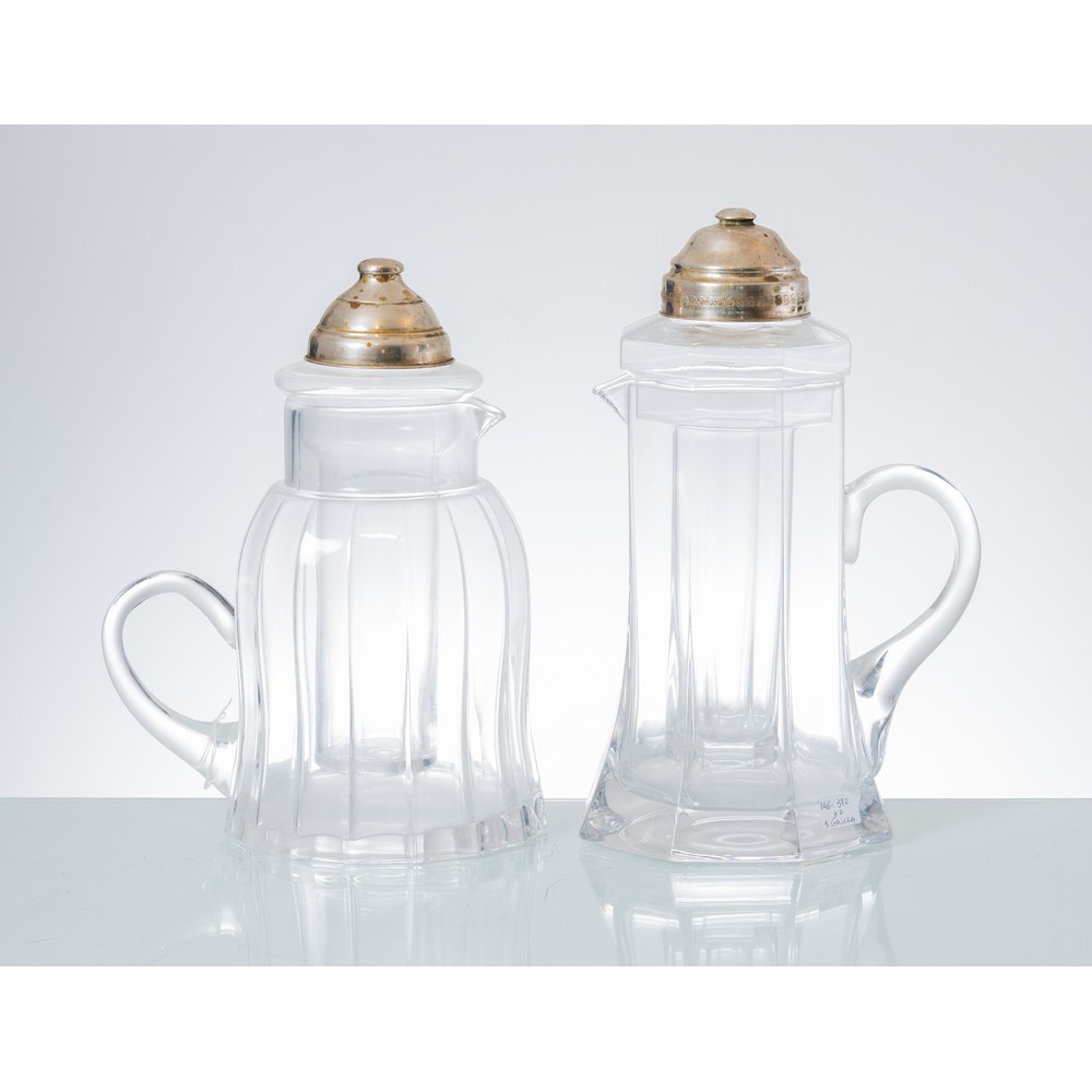 DUE CARAFFE da bibita in vetro con tappi in argento