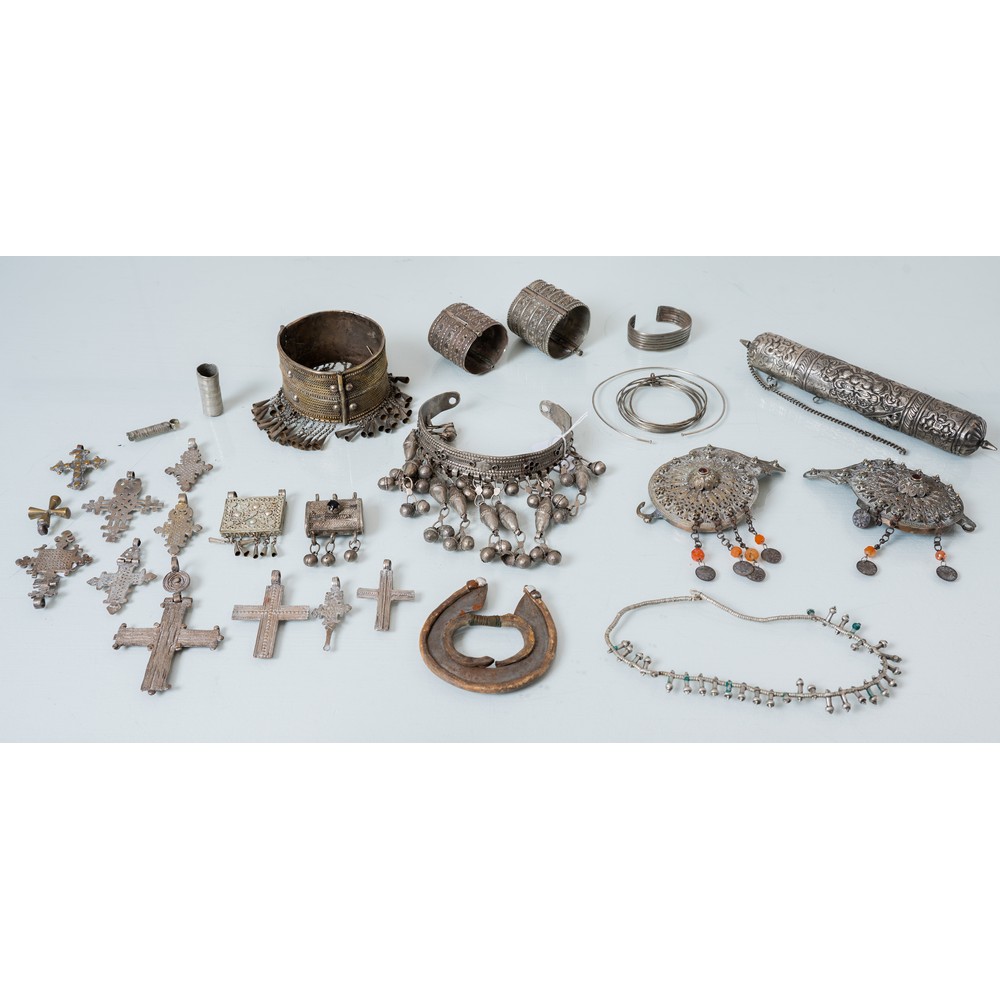 LOTTO di ventotto oggetti etnici in metallo di diversa tipologia, tra cui gioielli e croci.