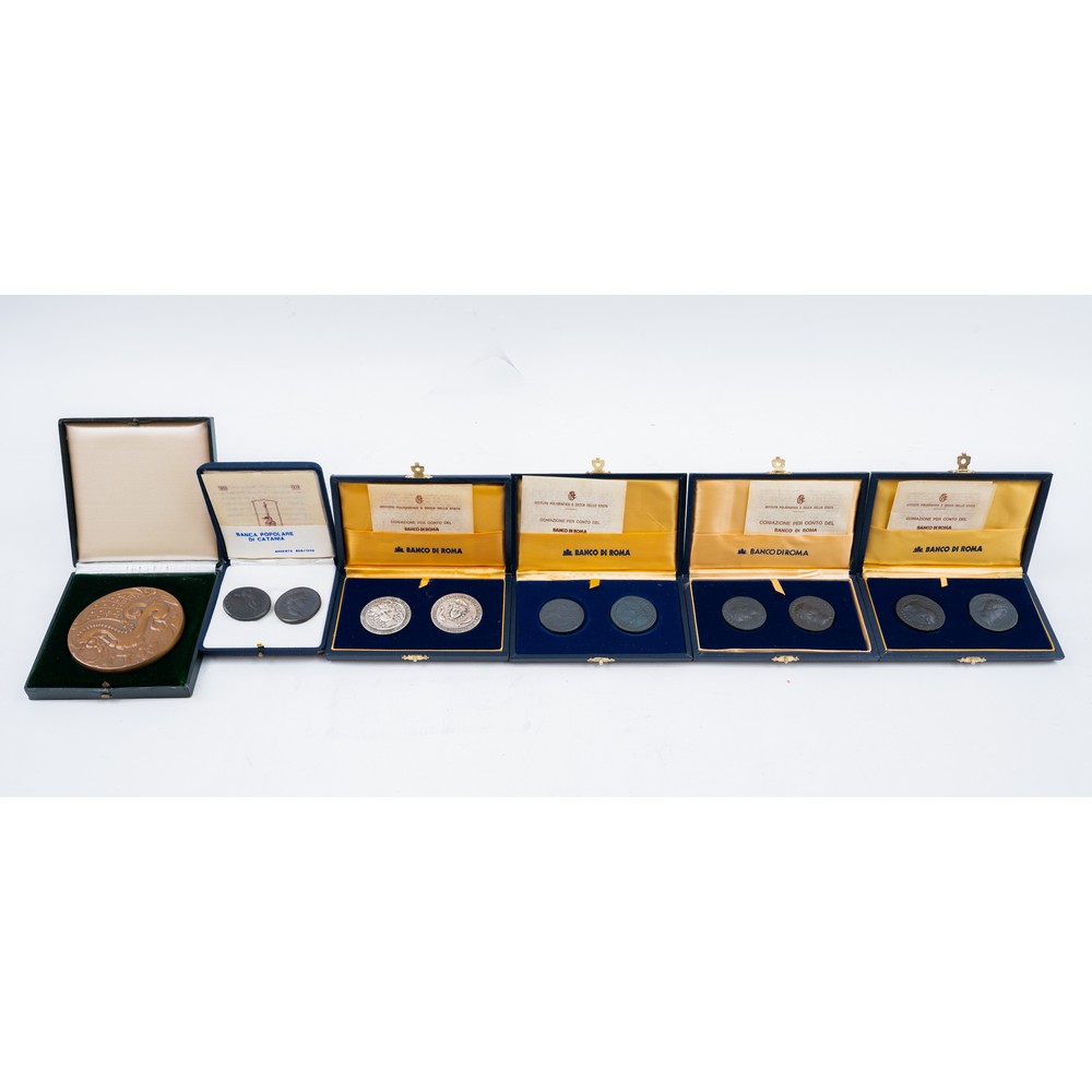 Moneta "Sesterzio" 81-82 d.C., "Sesterizio" post 161 d.C., "Sesterzio" 64-66 d.C., "Sesterzio" 140-144 d.C., "Sesterzio" 64-68 d.C., "Sesterizio" 64-66 d.C., "Sesterzio" 64-66 d.C., "Sesterzio" 88-89 d.C., "Tetradramma di Catania" 430-360 A.C. e altra moneta, medaglia coniata in occasione del XX anniversario della fondazione della Banca Europea per gli investimenti 1958-1978.