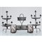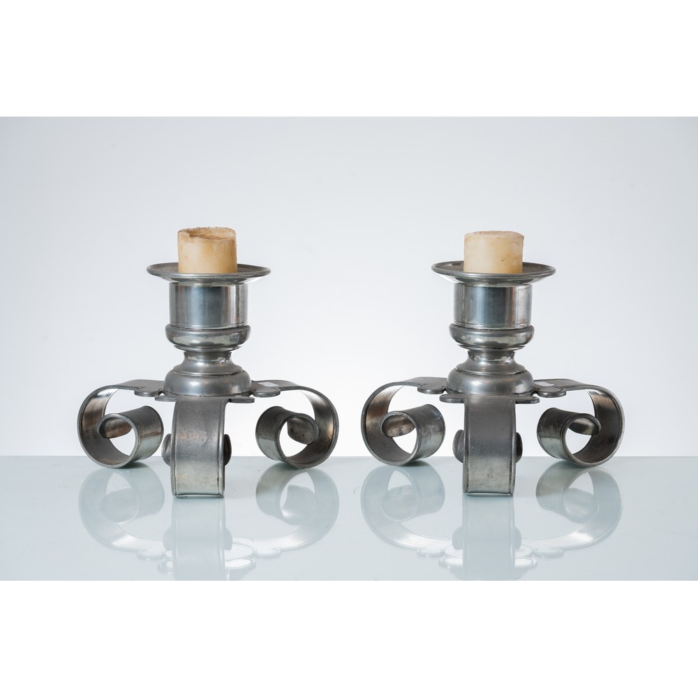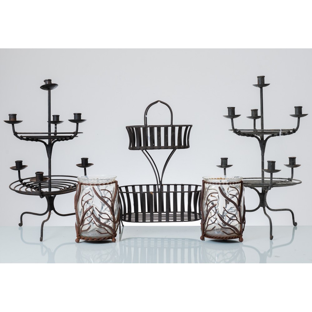Nove portaceri, cestino ed un vassoio in ferro e peltro.
