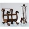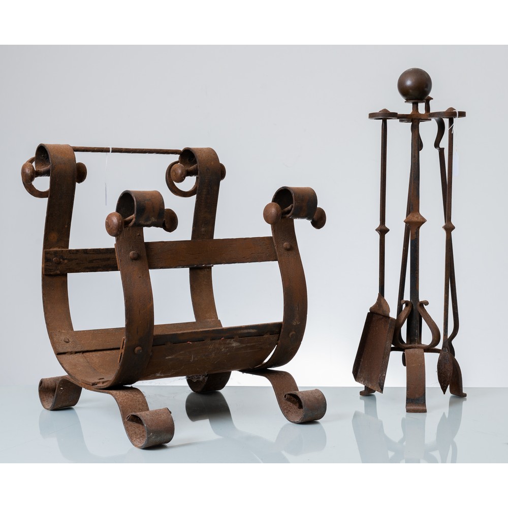 Quattro attrezzi in metallo; tre attrezzi in metallo con portattrezzi e portalegna.