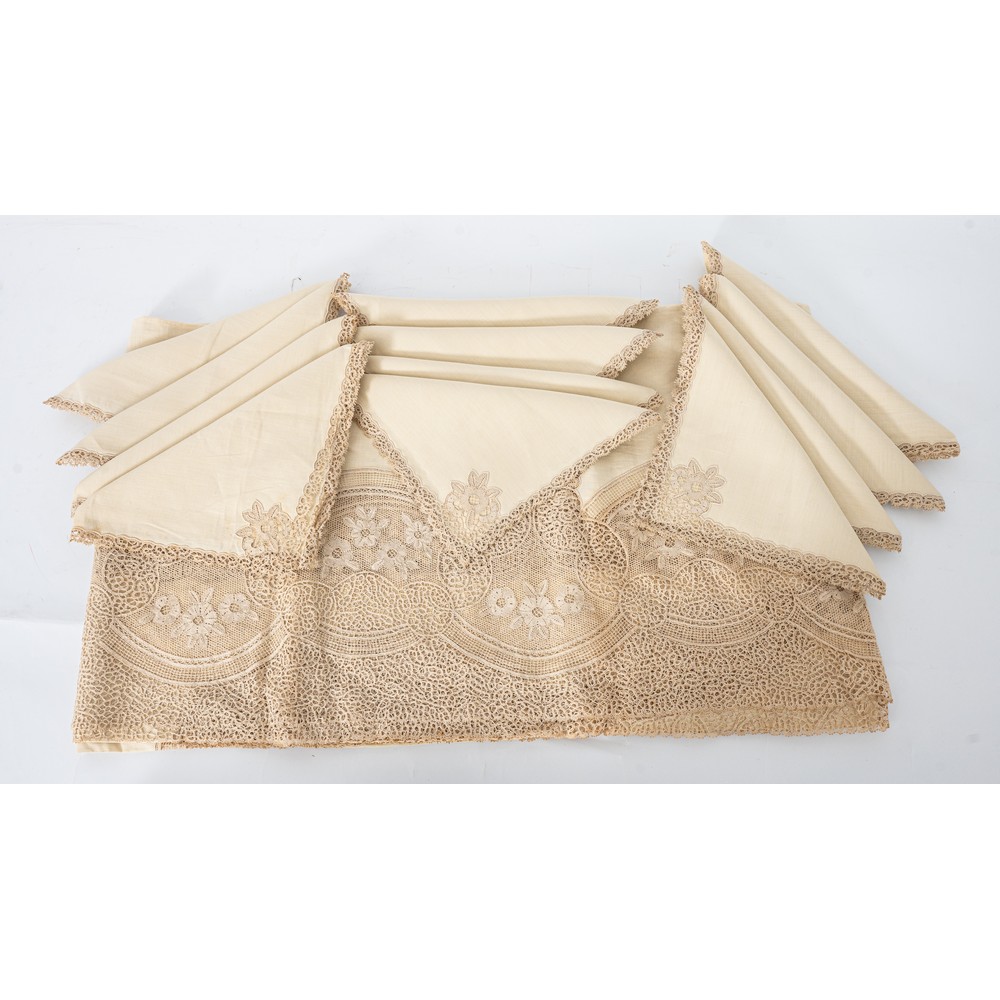 TOVAGLIA con dodici tovaglioli in lino ecrù, ricami a mano (macchie).