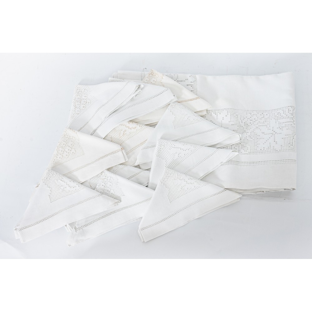 TOVAGLIA con dodici tovaglioli in cotone di lino nei toni del bianco, ricami ad intaglio (macchie).