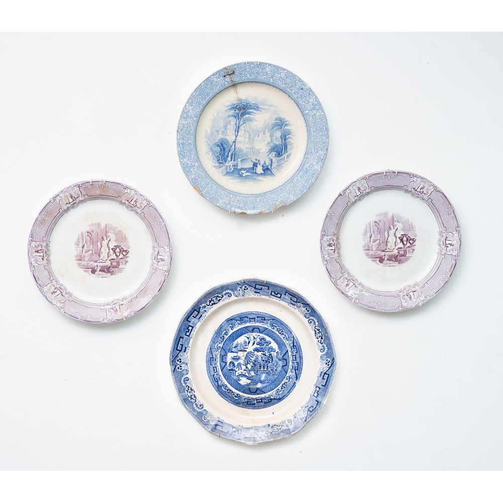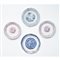 Quattro piatti da portata rotondi in porcellana decorata raffiguranti "Soggetti vari" (usure).