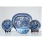 Piatto da portata, due piatti e zuppiera (senza coperchio) in porcellana decorata a motivo paesaggistico (usure).