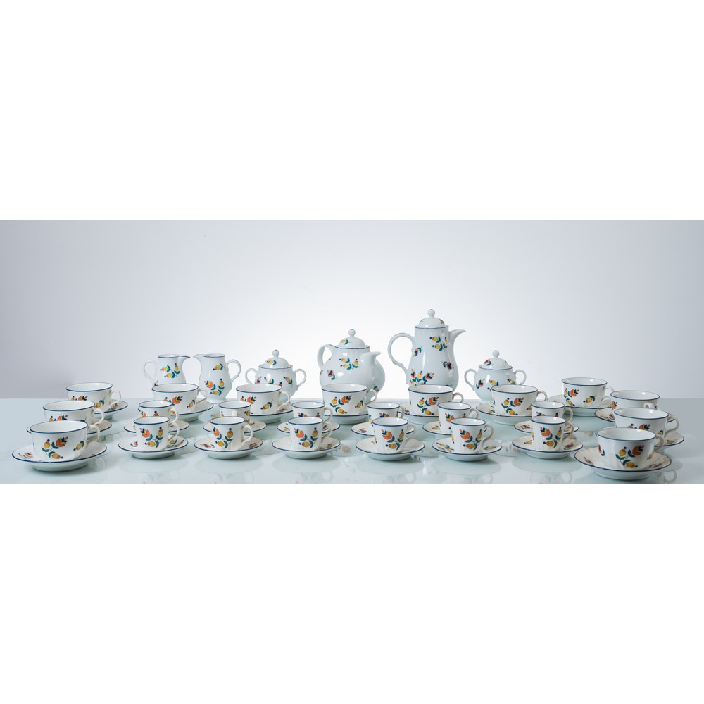 Servizio da tè in porcellana nei toni del bianco, decorata a motivo floreale composta da teiera, lattiera, zuccheriera e 12 tazze con piattini e servizio da caffè composto da caffettiera, lattiera, zuccheriera e 12 tazzine con piattino.