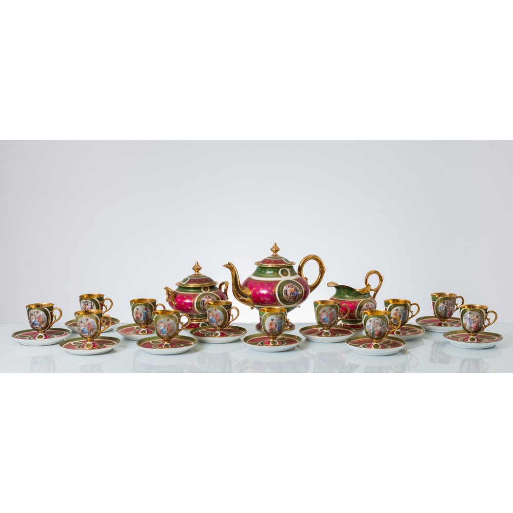 Servizio in porcellana decorata con lumeggiatura in oro composto da caffettiera, zuccheriera, lattiera e dieci tazzine con piattini raffiguranti "Soggetti mitologici"