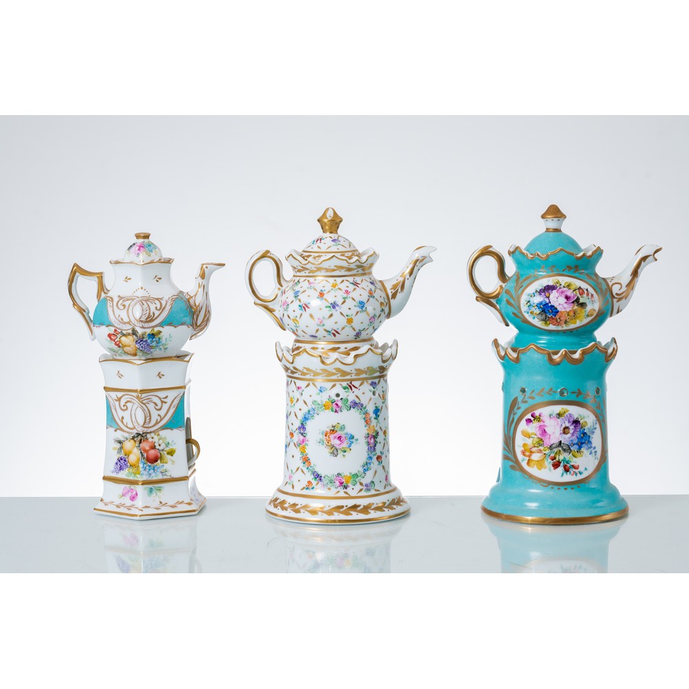 Tre tisaniere Luigi Filippo in porcellana decorata a motivo floreale e fogliaceo con lumeggiature in oro.