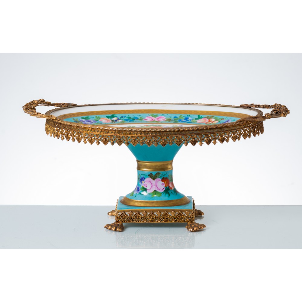 Centrotavola di forma ovale in porcellana Limoges decorata a mano, manici in bronzo dorato.