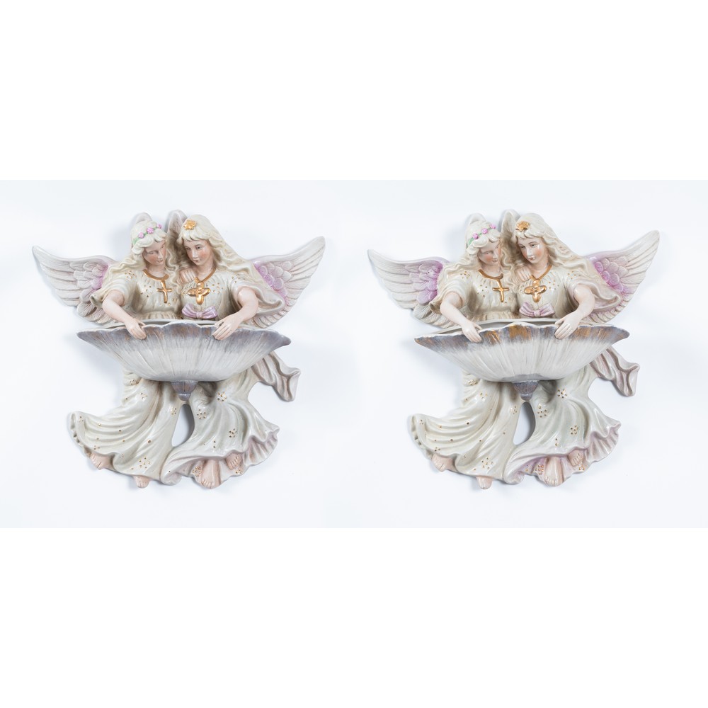 Coppia di acquasantiere in biscuit raffiguranti "Angeli che sorreggono conchiglia".