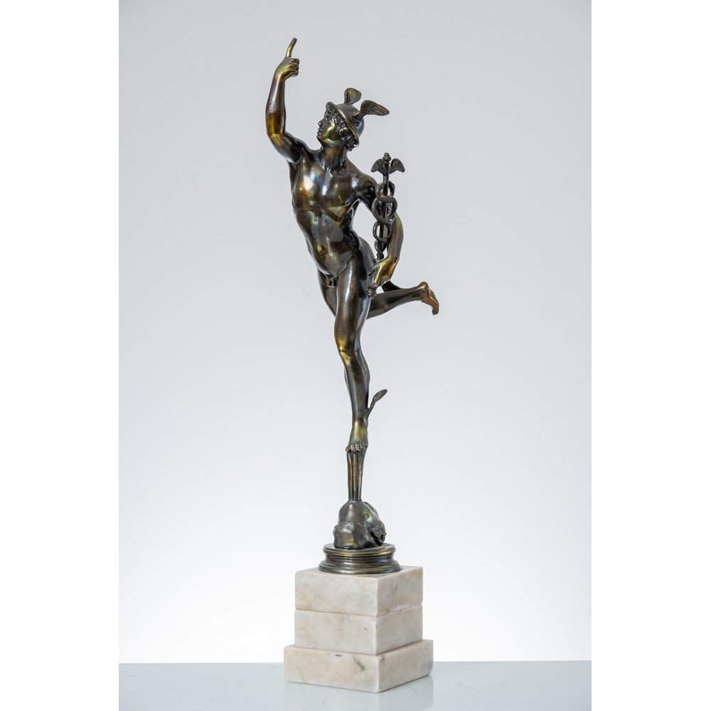 Scultura in metallo brunito raffigurante "Mercurio", base in marmo bianco.