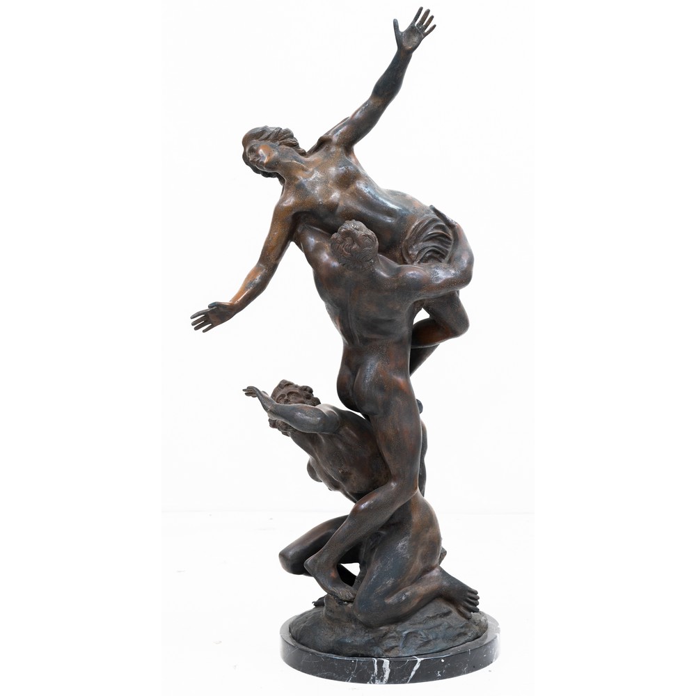 Gruppo in bronzo, fusione a cera persa raffigurante "Il Ratto delle Sabine", poggiato su base in marmo nero venato.