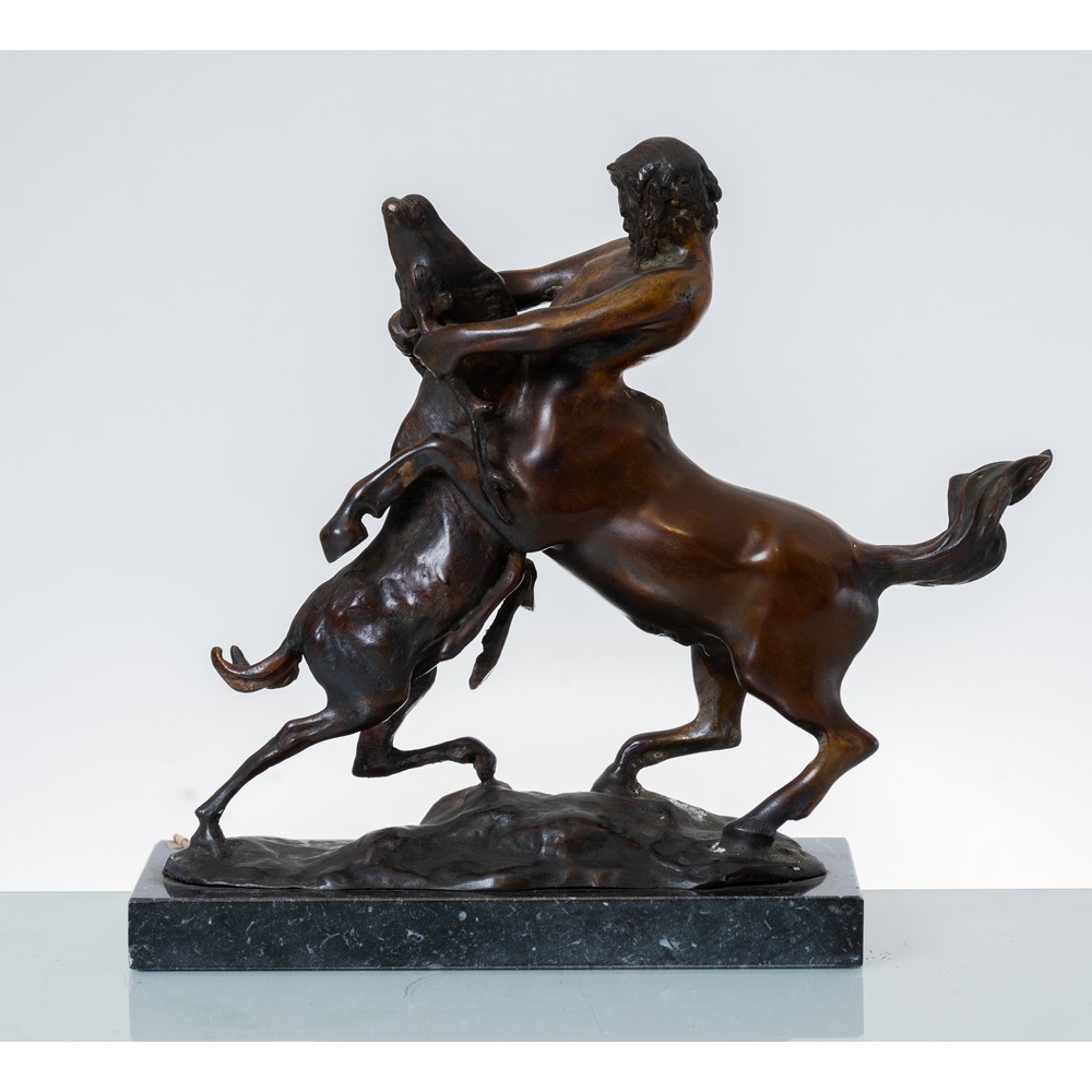 Scultura in bronzo, fusione a cera persa raffigurante scena mitologica "Lotta tra centauro e cervo", base in marmo nero.