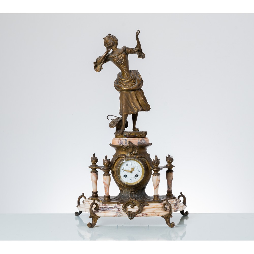 Orologio in marmo e antimonio con scultura nella parte superiore raffigurante "Fanciulla" (usure).