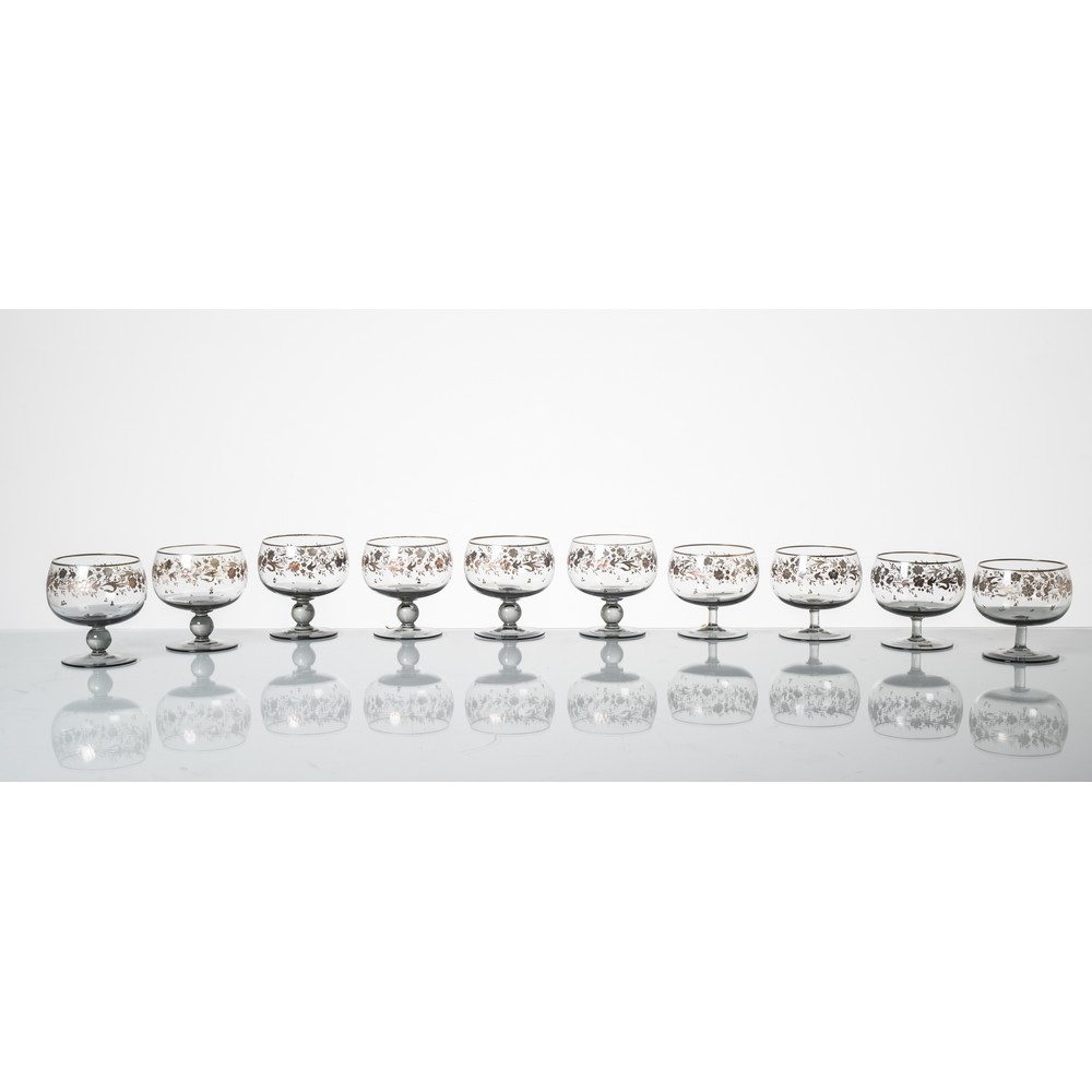 Dieci coppe da macedonia in cristallo fumè inciso e lavorato a motivo floreale, bordo dorato.