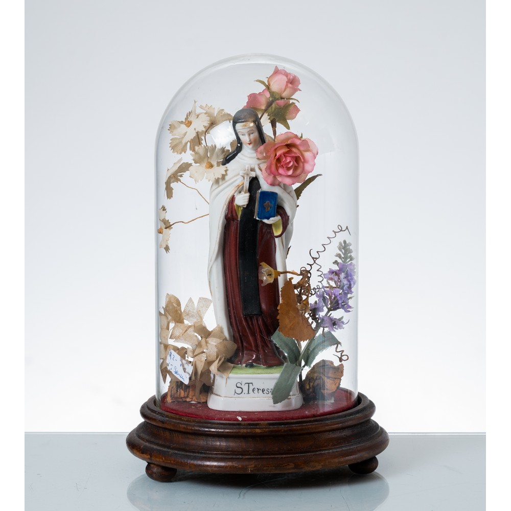 Scultura in biscuit raffigurante "Santa Teresa", entro teca in vetro con addobbi floreali in tessuto.