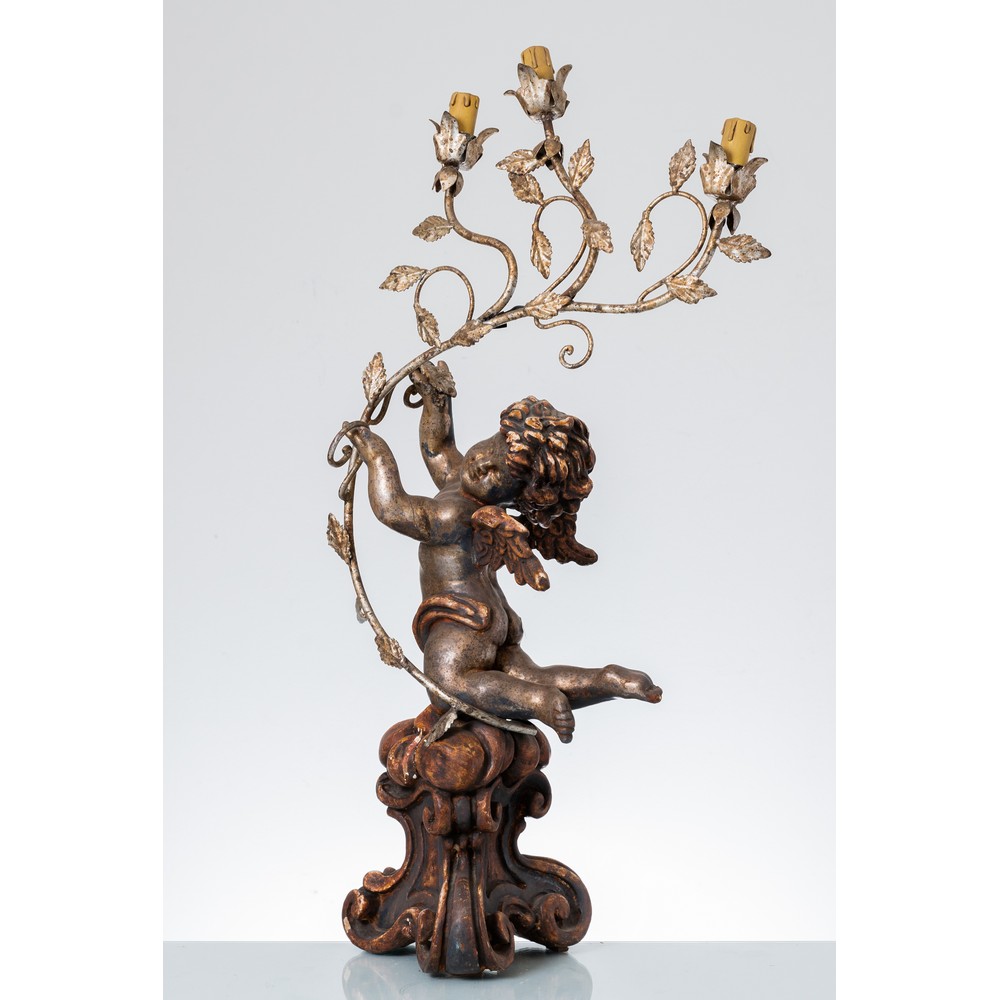 Candelabro a tre luci sorretto da putto, base in legno e ferro.
