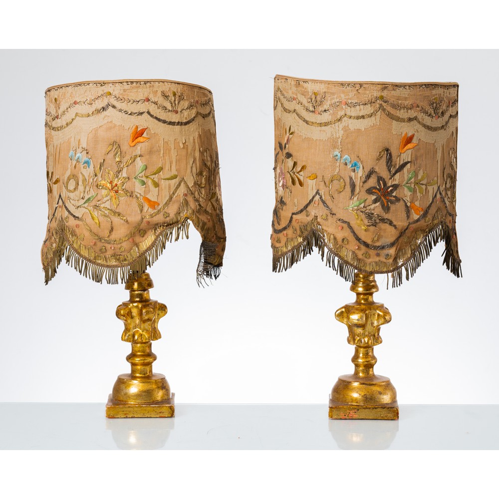 Coppia di pigne in legno dorato ad argento e mistura, con ventole in tessuto riccamente lavorato (elettrificato).