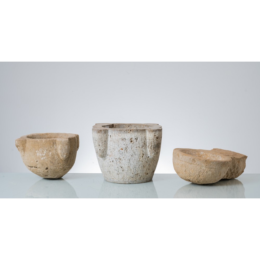 MANIFATTURA SICILIANA XIX SECOLO, Due mortai e acquasantiera