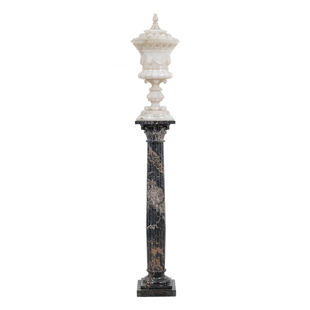 Grande lampada con coperchio in alabastro di gusto neoclassico, colonna coeva in marmo nero portoro.