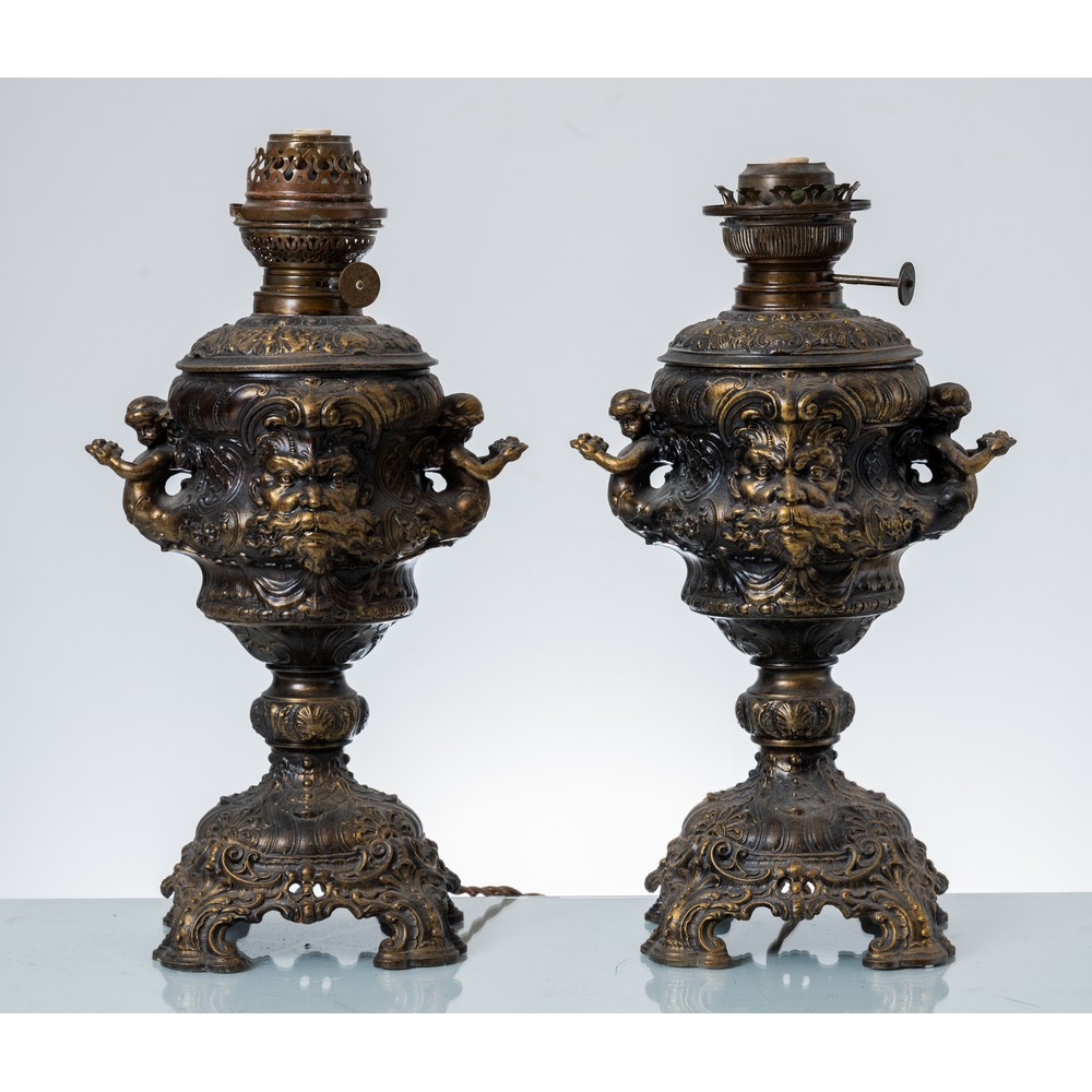 Coppia di lumi a petrolio in metallo (mancanti di tubi e bocce).