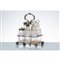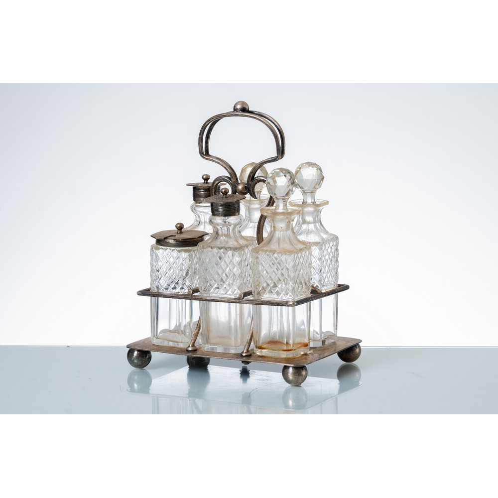 MENAGE in metallo argentato con bottiglie in cristallo (usure).