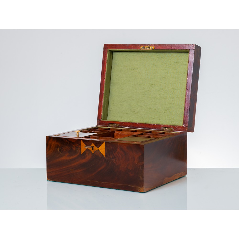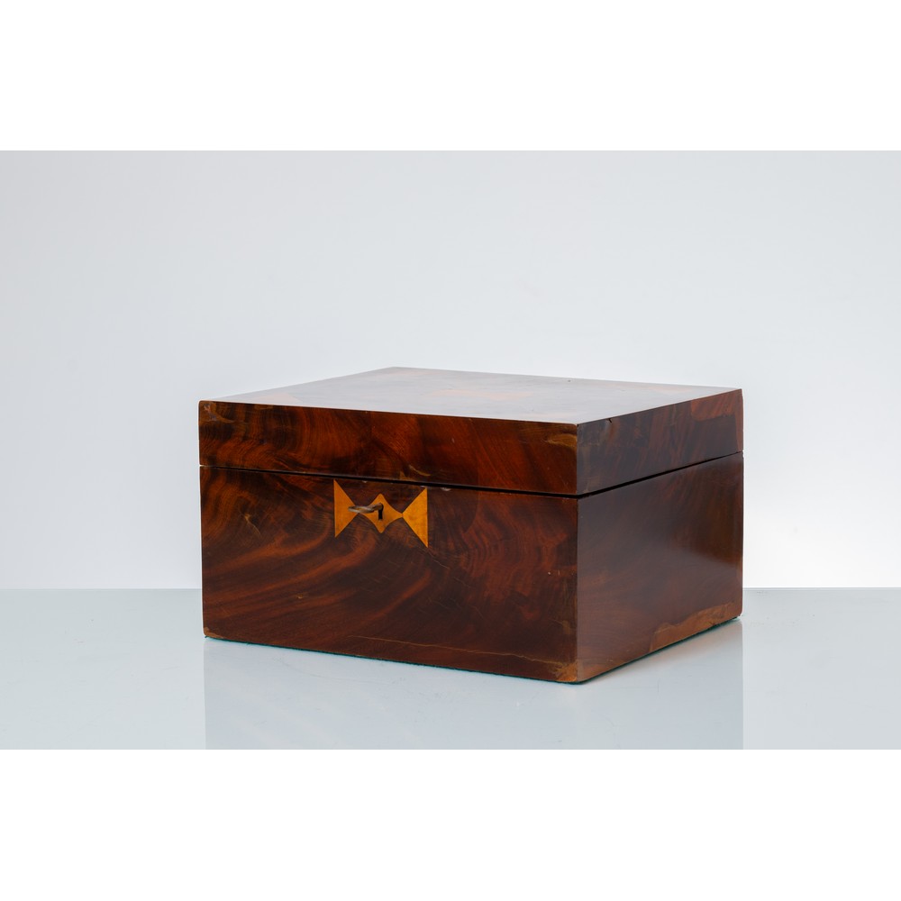 Cassetta portagioie in legno di mogano, radica di tuja e bosso.