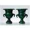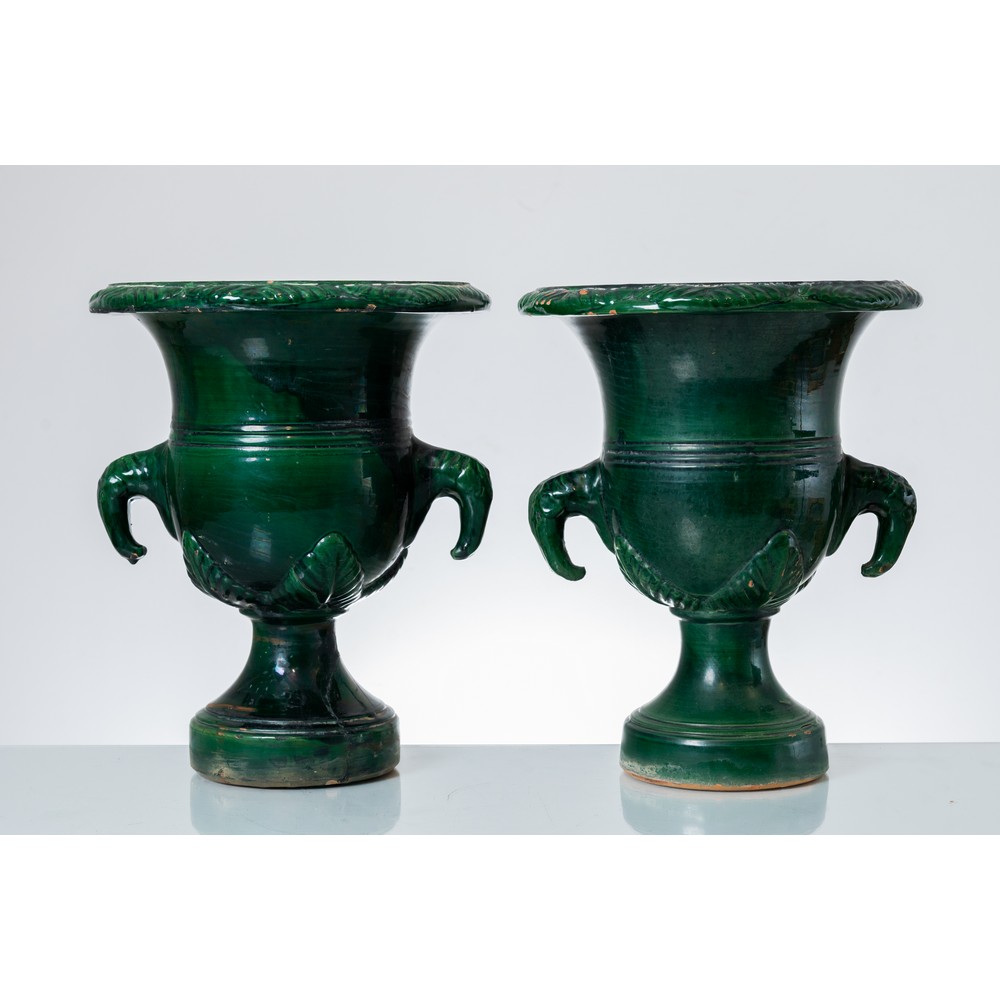 Coppia di portapiante a cratere in terracotta smaltata nei toni del verde (usure).