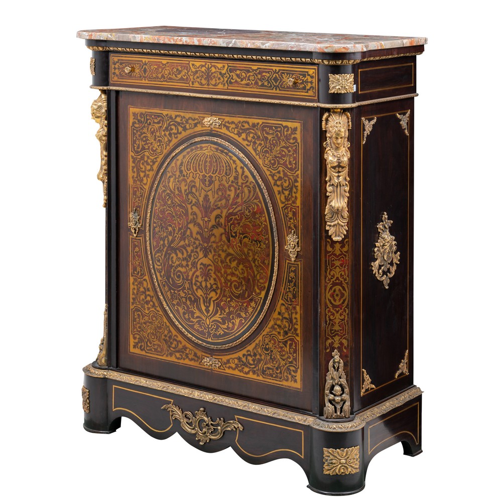 Piccola credenza Boulle ad un'anta in legno ebanizzato, tarsie in ottone, guarniture in bronzo.