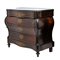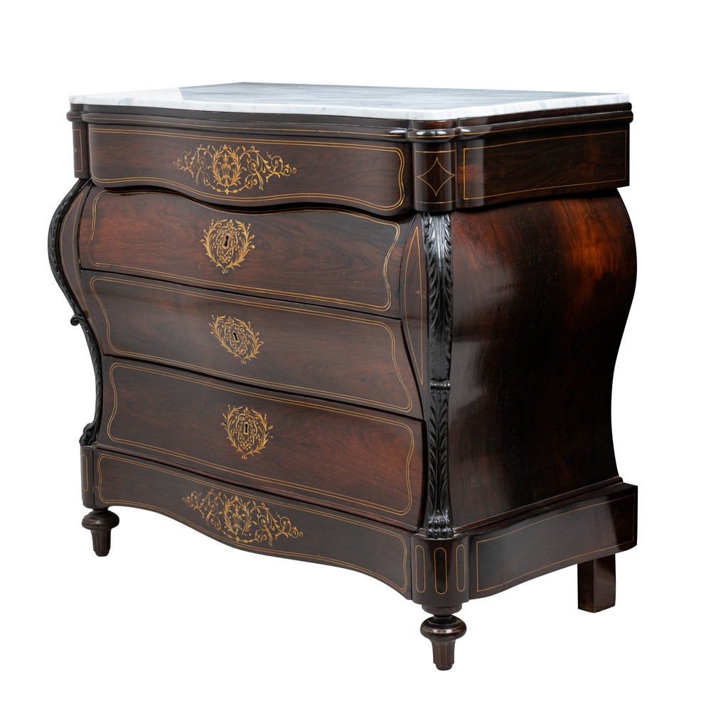 Cassettone Isabellino di forma sagomata a cinque cassetti in legno esotico, tarsie in ottone, piano in marmo bianco venato.