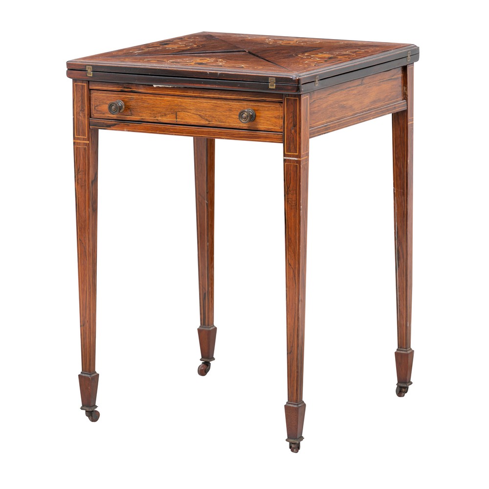 Tavolino da gioco a fazzoletto con cassetto laterale in legno esotico, tarsie in bosso e osso.