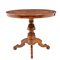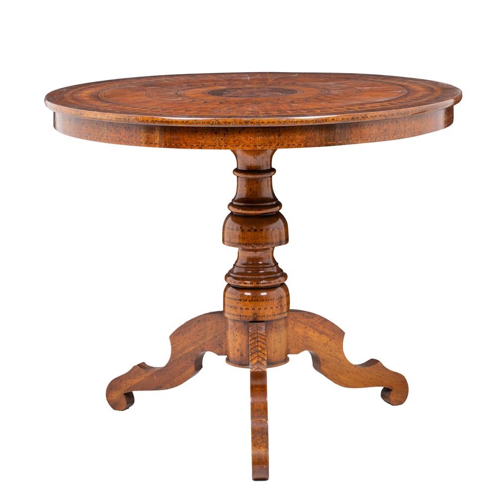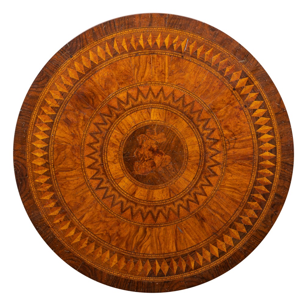 Tavolo da centro a vela, di forma circolare in legno di noce, di gusto sorrentino, riccamente intarsiato in varie essenze di legno a disegno geometrico, decoro al centro raffigurante "San Giorgio che uccide il drago".