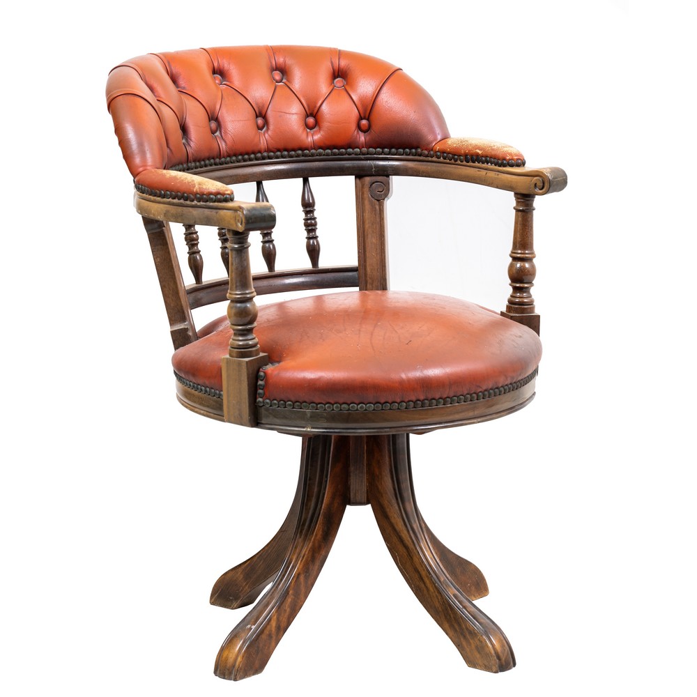 Poltrona girevole da studio di gusto navale in legno di mogano, seduta e spalliera in pelle.