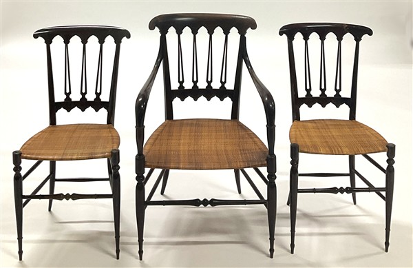 Sedie Sanguineti. Lotto composto due sedie e una poltrona chiavarina. Chiavari, seconda metà secolo XX. (difetti e restauri)