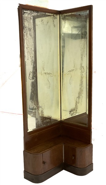 Specchiera Novecento ad angolo montata su base a stipo con due ante. Italia, anni '30. Mogano impiallacciato. (cm 72x206x54) (gravi difetti)