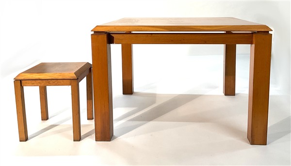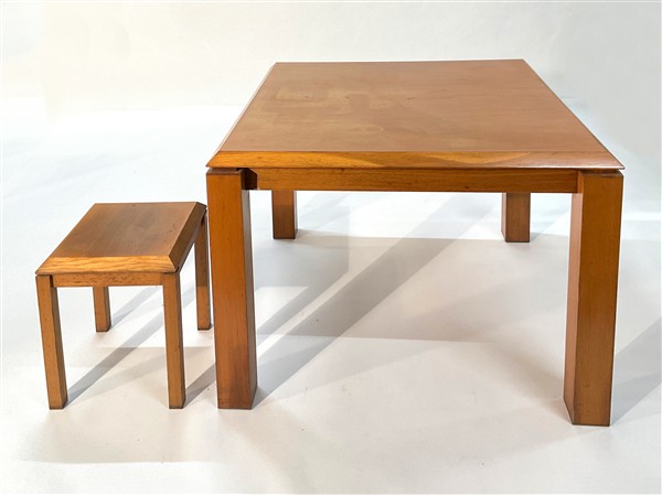 Lotto di un tavolo e un tavolino ensuite in legno impiallacciato. Italia, anni '70. (cm e 40x45x40) (difetti)
