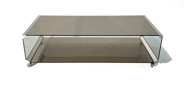 Carrellino in vetro fumé a due ripiani con profili in metallo cromato. Italia, anni '70. (cm 129x38x54,5) (lievi difetti)