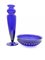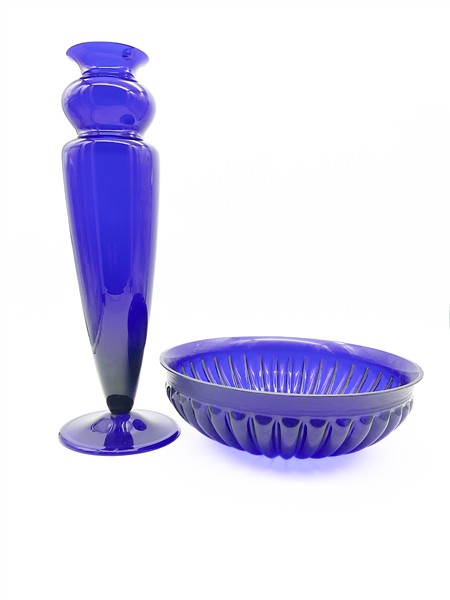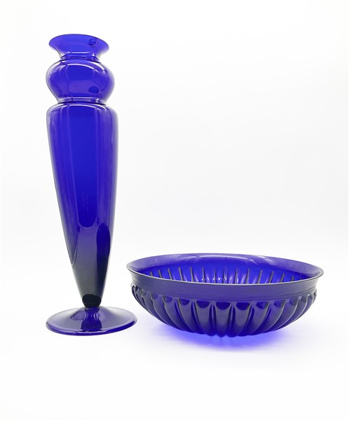Lotto composto da un bacile costolato della manifattura di Veart e un vaso della manifattura di Auras in vetro soffiato blu trasparente. Murano, anni '70/'80. Firmati a punta sotto la base. (h cm 47; d cm 33)