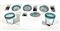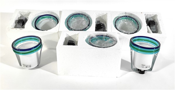 Lotto di sei faretti da incasso. Produzione Leucos, Murano, anni '70. Diffusore in vetro di Murano incamiciato lattimo con fascia inferiore a fili circolari trasparenti e di colore azzurro, blu e verde. Recanti etichetta del produttore. (d cm 14, altezza regolabile) (lievi difetti)