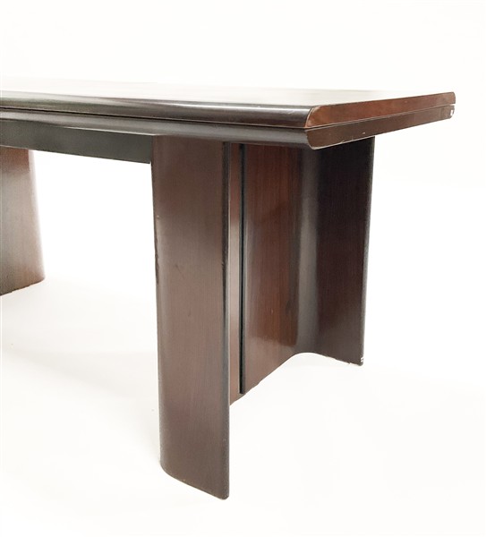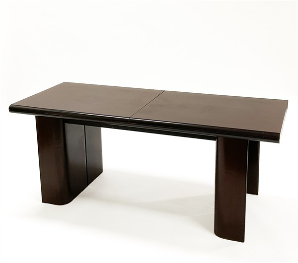 Tavolo da pranzo ampliabile. Italia, anni '70. Legno massello e impiallacciato. (chiuso cm 180,5x74x75) (difetti)