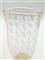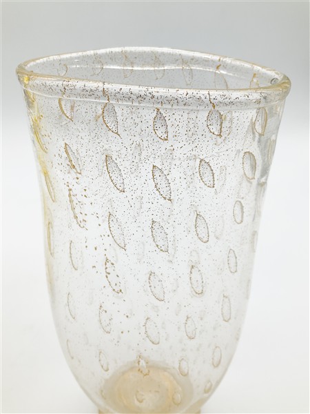 Vaso della serie "Opalini" in vetro soffiato incamiciato giallo e lattimo; unito a un vaso in vetro soffiato cristallo con inclusione di bolle regolarmente disposte e foglia d'oro. Murano, seconda metà secolo XX. (h max cm 24)