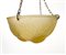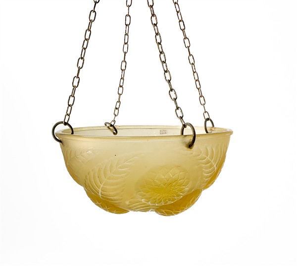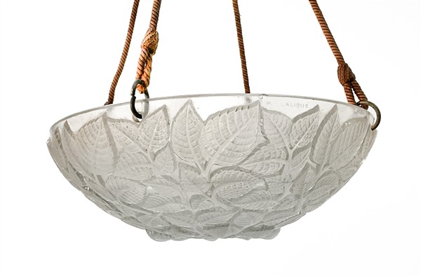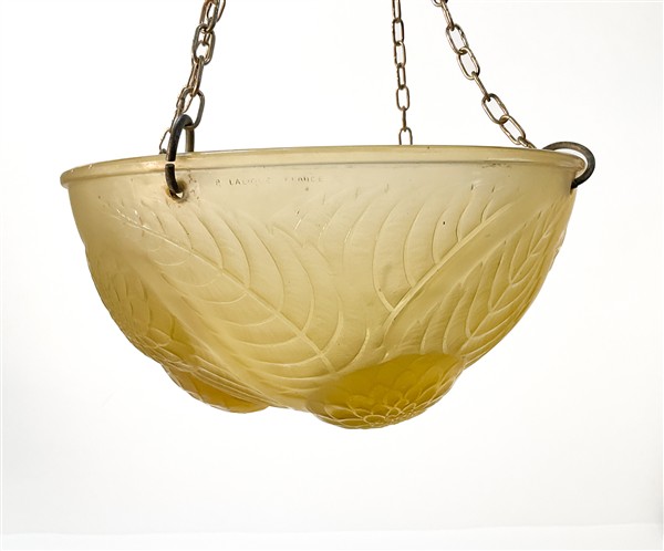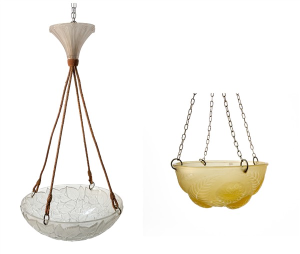 Due lampade a cesendello in vetro soffiato in stampo, una gialla trasparente con crisantemi e firmata a stampo sul bordo "R. LALIQUE FRANCE" (d cm 30,5) e l'altra incolore con follage firmata a incisione "R. LALIQUE" (d cm 34). (lievi difetti)
