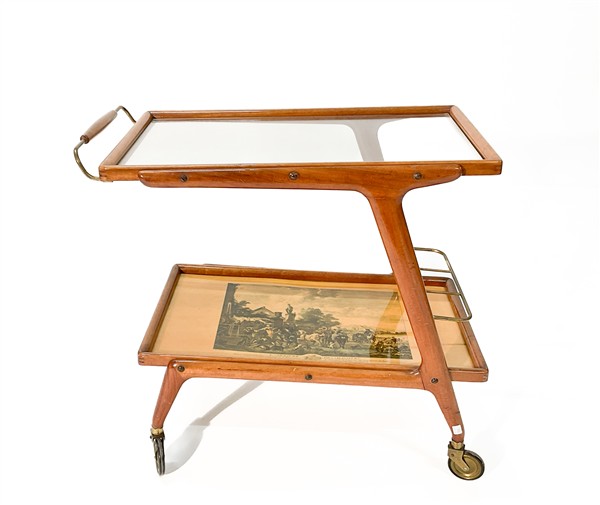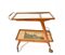 Carrello portavivande in legno con due ripiani, portabottiglie in tubolare di ottone. Italia, anni '50/'60. (difetti)