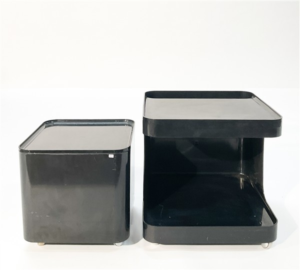 Lotto composto da un comodino modello "1030" (cm 50x50x50) e da un mobiletto modello "1020" (cm 40x39,5x40). Produzione Game-collezioni Longato, Padova, anni '70. ABS nero. Marcati sotto la base. (difetti)